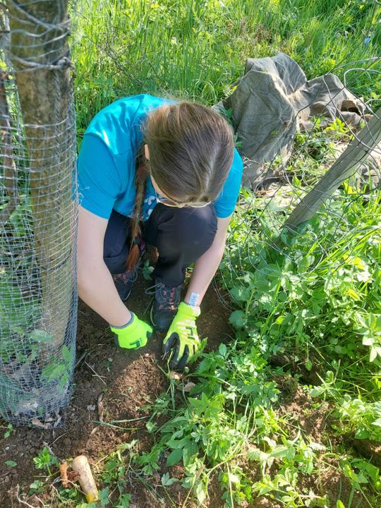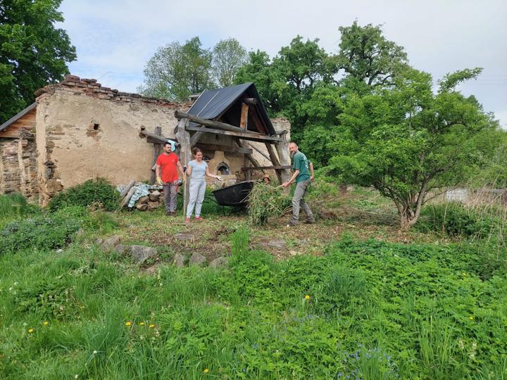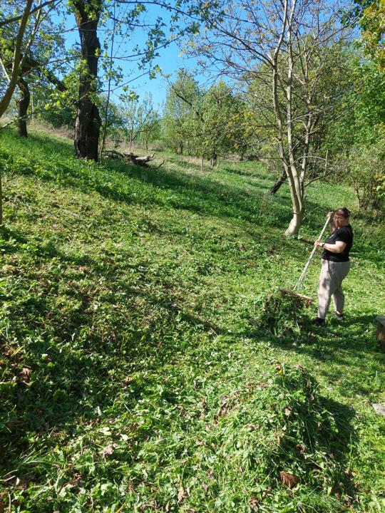Plení a kypření půdy kolem nově vysázených stromků, přehazování kompostů, úklid lokality (likvidace stavebního materiálu).