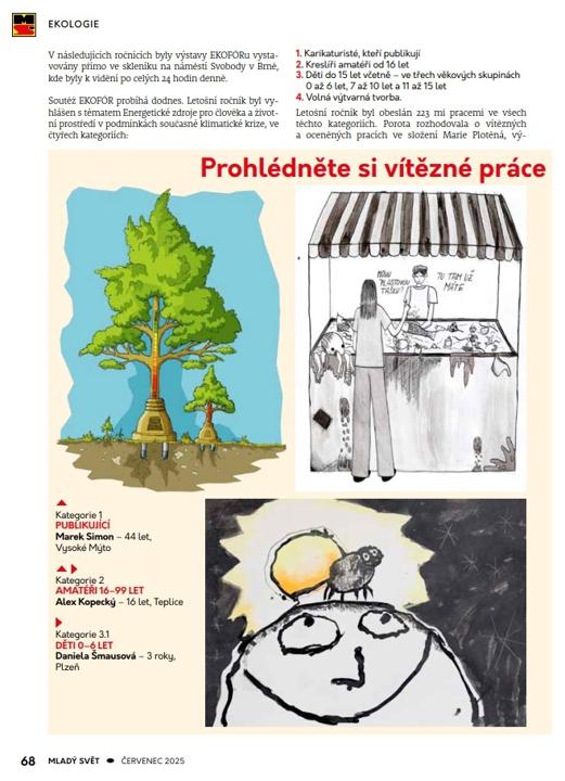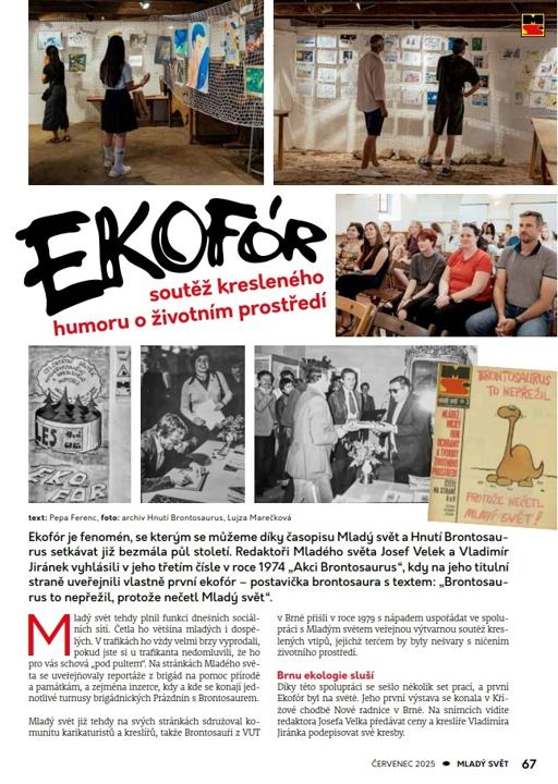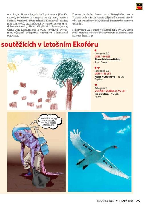 Na přiložených fotografiích vidíte vyhlášení soutěže Ekofór 2025 a zahájení výstavy MRP v Toulcově dvoře 26.6.2025 a tři stránky z časopisu Mladý Svět s článkem o Ekofóru.
