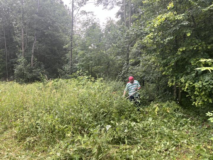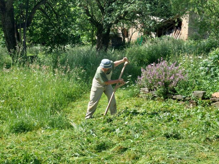 Vysoce pracovní akce v plném tempu. Seč stoji i kosami a shrabování posečené biomasy.