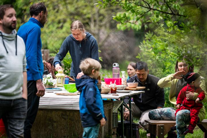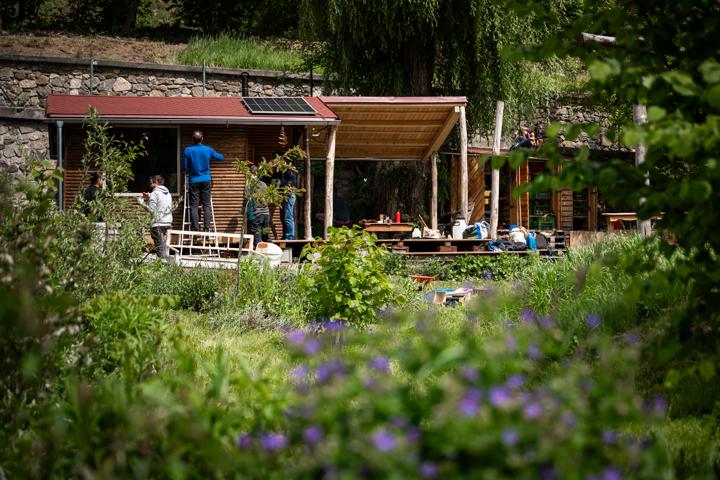 Společně pečujeme o celý prostor – sekáme trávu, hrabeme listí, kompostujeme a pořádáme pravidelné brigády. Každá ruka navíc je vítaná!